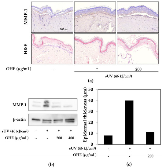 MMP-1, also known as fibroblast collagenase, plays a critical role in UV-mediated photoaging leading to ECM degradation in the skin [18]. We hypothesized that suppressing the UV-induced MMP-1 expression could prevent skin photoaging. To determine the effect of sUV exposure and OHE treatment on MMP-1 expression, ex vivo human skin was used. MMP-1 expression was noticeably increased by sUV exposure (Figure 4a), while treatment with OHE suppressed the sUV-induced MMP-1 expression. We also implemented western blot analysis using a skin tissue lysate, which showed similar results. The sUV-radiated group exhibited an increase in MMP-1 expression, and OHE pretreatment significantly reduced this increase (Figure 4b). Histological studies showed that enhanced epidermal thickness induced by UV radiation could be used as a parameter of skin photoaging [19]. To determine the effect of sUV exposure on epidermal thickness, human skin was stained with hematoxylin and eosin (H&E). As shown in Figure 4a,c, the epidermal thickness was substantially increased by sUV exposure compared with that in the normal skin. Surprisingly, OHE treatment dramatically reduced the epidermal thickness of the human skin.