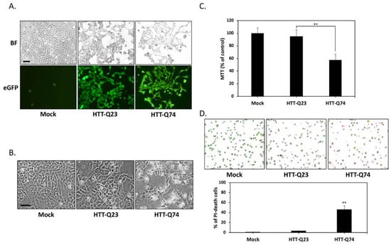2.1. Q74-mHTT Overexpression Causes Significant Neuronal SK-N-MC Cell Death