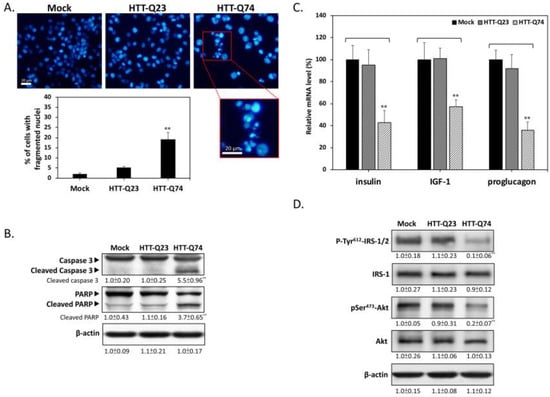 To determine the mode of cell death that is induced by mHTT, we used DAPI nuclear staining to investigate the occurrence of nuclear condensation and fragmentation. As shown in Figure 2A, nuclear fragmentation was significantly enhanced in the HTT-Q74-overexpressing group compared with that in the mock- or HTT-Q23 transduced groups after 48 h of transfection. This result was also confirmed through Western blot analysis, which showed that HTT-Q74 increased the cleavage of caspase 3 and PARP, which are two typical apoptosis markers (Figure 2B). The expression levels of insulin and IGF-1 are downregulated in brain neurons derived from mHTT knock-in mice [15]. To determine the effects of HTT on the expression of genes related to insulin signaling, we performed relative expression qPCR assays to measure the levels of mRNA transcripts in SK-N-MC cells. As shown in Figure 2C, HTT-Q74 overexpression in SK-N-MC cells strongly suppressed the mRNA levels of insulin, IGF-1, and proglucagon (the pro-hormonal precursor mRNA of GLP-1) over a 48 h period. However, no significant changes were found in the expression of these mRNA transcripts in the HTT-Q23-overexpressing group compared with that in the mock control, indicating that mHTT overexpression may downregulate insulin/IGF-related signaling in neuronal cells. To further elucidate whether mHTT overexpression interferes with insulin signaling, we conducted Western blot analysis to detect the levels of the phosphorylation of insulin receptor substrate-1/2 (IRS-1/2) at residue Tyr612, which is a hallmark that positively regulates insulin signaling. As shown in Figure 2D, 48 h of HTT-Q74 overexpression decreased Tyr612 IRS-1/2 phosphorylation [18]. Accordingly, the phosphorylation of the insulin downstream target Ser473 Akt decreased in the HTT-Q74-overexpressing group relative to that in mock- or HTT-Q23-transduced groups. These results collectively demonstrated that mHTT overexpression can promote neuronal apoptosis and insulin signaling blockade.