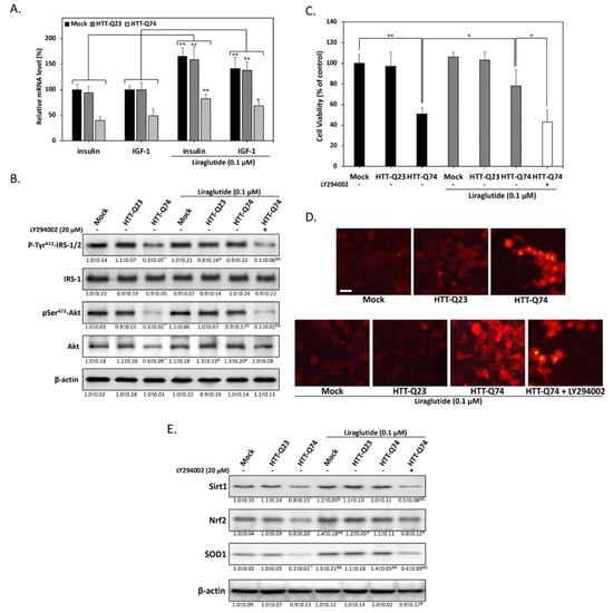 We purchased chemicals, such as 3-(4,5-dimethylthiazol-2-yl)-2,5-diphenyltetrazolium bromide (MTT), 4′,6-diamidino-2-phenylindole (DAPI), acridine orange (AO), dihydroethidium (DHE), and LY294002, from Sigma (München, Germany). We purchased pEGFP-Q23 HTT (Plasmid# 40261) and pEGFP-Q74 HTT (Plasmid# 40262) from Addgene (Cambridge, MA, USA). We purchased antibodies against caspase 3, poly(ADP-ribose) polymerase (PARP), Akt, p-Akt, AMPK, p-AMPK, Nrf2, and p-IRS-1/2 (Tyr 612) from Santa Cruz Biotechnology (Santa Cruz, CA, USA). Antibodies against IRS-1 were obtained from Cell Signaling Technology (Danvers, MA, USA), and β-actin and LC3 antibodies were obtained from Novus Biologicals (Littleton, CO, USA). Antibodies against SOD1, Sirt1 were purchased from GeneTex (Irvine, CA, USA). Liraglutide was purchased from Novo Nordisk (Copenhagen, Denmark). All chemicals dissolved in phosphate buffer saline solutions and stored at −20 °C until needed for use in experiments.