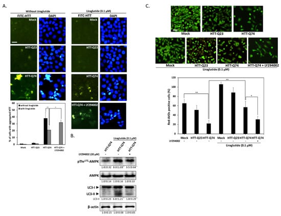 Liraglutide upregulates autophagy by activating AMPK and reducing HTT aggregation in HTT-Q74-overexpressed cells. (A) Immunofluorescence images showing that 48 h of HTT-Q74 overexpression increased the number of HTT aggregates. The percentage of cells contained HTT aggregates was calculated from five images of each treatment. Green: HTT, FITC, Blue: nuclei, DAPI; (B) Levels of p-AMPK/AMPK and LC3-I/II protein in HTT-Q74-overexpressing cells. Liraglutide markedly upregulated LC3-II and AMPK Thr172 phosphorylation. This effect, however, was abolished by LY294002; (C) Representative images of AVO-positive cells treated through AO staining. The percentage of red-AVO positive cells was calculated from five images of each treatment. All data were collected from at least three independent experiments, and values are presented as mean ± SEM. The significance of differences was determined through multiple comparisons with Dunnett’s posthoc test for * p < 0.05 and ** p < 0.01 compared with mock groups. Scale bar represents 20 μm.
