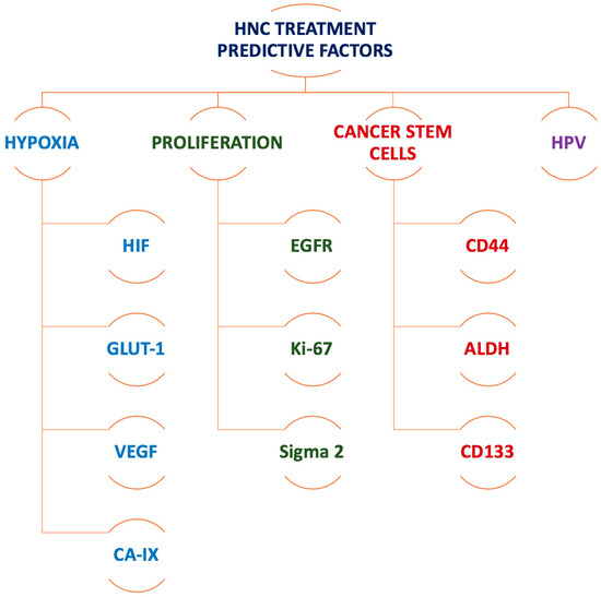 Summary of the most commonly investigated biomarkers that affect head and neck cancer (HNC) response to treatment. HPV, human papilloma virus; HIF, hypoxia inducible factor; GLUT-1, glucose transporter 1; VEGF, vascular endothelial growth factor; CA-IX, carbonic anhydrase IX; EGFR, epithelial growth factor receptor; Ki-67, cell proliferation-associated nuclear antigen; CD, cluster of differentiation molecule; ALDH, aldehyde dehydrogenase.