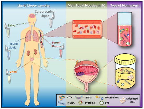 Thus, the potential use of liquid biopsy as a new non-invasive approach to improve BC management is far reaching. Even though their extensive applications are only starting to emerge in clinical practice, multiple studies have indicated the potential use of different biomarkers in liquid biopsies for BC. In this review, we provide an overview of the more important studies regarding the different types of biomarkers in liquid biopsy and their clinical applications in BC.