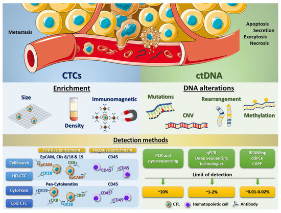 CTC and ctDNA processing methods. Scheme showing some enrichment techniques to isolate CTCs from peripheral blood cells (erythrocytes and leukocytes) and different detection systems based on immunomagnetic assays, using specific antibodies to recognize antigens present in tumour cells (like EpCAM or cytokeratins) as well as to exclude leukocytes (using antibodies against CD45) (left panel). Right panel displays the different DNA alterations (including mutations, copy number variations (CNVs), gene rearrangements or methylation variations) which can be analysed from ctDNA, as well as different detection methods and their correspondent limit of detection.