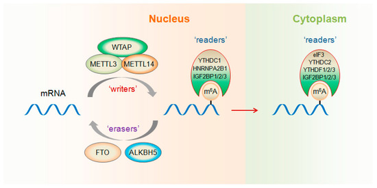 m6A RNA modification can be installed enzymatically by various methyltransferases, collectively termed m6A “writers”. The first identified human RNA m6A methyltransferase was METTL3. In 1997, a ~200-kDa methyltransferase complex exhibiting methyltransferase activity was isolated from HeLa cell nuclear extract, and a 70-kDa subunit containing the S-adenosylmethionine-binding site was identified [33]. Because of its molecular weight, this subunit was named MT-A70 (or METTL3). In 2014, METTL14 was discovered as another RNA methyltransferase, sharing 43% identity with METTL3 and forming a stable heterodimer core complex with it [34]. This METTL3–METTL14 complex functions in cellular m6A deposition on mammalian nuclear RNAs (Figure 1). Besides METTL3 and METTL14, Wilms’ tumor 1-associating protein (WTAP) has been identified as another component of the human m6A methyltransferase complex [34,35]. By interacting with METTL3 and METTL14, WTAP contributes to their localization into nuclear speckles [35]. Moreover, WTAP is necessary for the catalytic activity of m6A methyltransferase in vivo. Therefore, WTAP functions as a regulatory subunit in the m6A methyltransferase complex and promotes recruitment of the m6A methyltransferase complex to mRNA targets [35]. Recently, METTL16 was revealed to be another kind of human m6A methyltransferase that binds to pre-mRNAs and non-coding RNAs including the U6 snRNA [36].