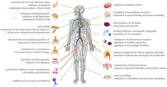 In contrast to the well-known actin scavenging and clearance activity of gelsolin, there are a limited number of data about other functions of gelsolin’s isoforms present in extracellular fluids. For this reason, studies focused on pGSN were extended to evaluate the mechanisms by which gelsolin is involved in apoptosis, signal transduction, epigenetic processes, transcriptional regulation, modulation of inflammatory response, and pathogenesis of diseases. Consequently, apart from its role in sequestering actin in extracellular compartments, it was established that pGSN modulates immune responses by preferential binding of bacterial cell wall-derived compounds, i.e., lipopolysaccharides (LPS) and lipoteichoic acid (LTA) from Gram-negative and Gram-positive bacteria, respectively. Gelsolin can also prevent toll-like receptor (TLR) activation, due to the structural similarity between intracellular gelsolin-binding molecules (phosphatidylinositol 4,5-bisphosphate and lysophosphatidic acid (PIP2 and LPA)) and bacterial endotoxins [25]. In addition, pGSN binds to a broad spectrum of bioactive compounds, including LPA, sphingosine-1-phosphate (S1P), and platelet activating factor (PAF), enhancing the protective properties of GSN in inflammatory states, and suggesting a role in processes such as wound healing, tissue remodeling, cancer development, or angiogenesis (Figure 2) [26,27,28]. These cellular effects partially overlap with the roles of other gelsolin superfamily members. Previous studies demonstrated that in addition to their impact on actin filament remodeling, gelsolin-related proteins (incl. flightless I, capG and adseverin) play roles in diminishing LPS- and TLR-mediated inflammation processes, wound healing, osteoclastogenesis, and endothelial cell response to mechanical forces [29,30,31]. These results highlight the diversity of biological roles of gelsolin, and due to its strong impact on a broad spectrum of cytoskeleton- and inflammatory-related biological processes, its potential as biological indicator in a variety of diseases and medical conditions.