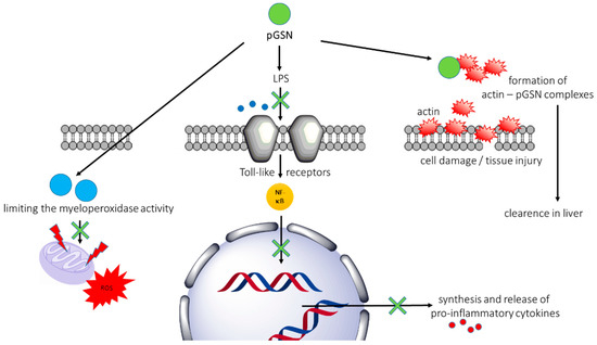 Apart from the actin scavenging properties of plasma gelsolin, one of the most important features of extracellular gelsolin for its protective role in sepsis is the ability of pGSN to selectively interact with bacterial wall products (i.e., LPS from gram-negative, and LTA from gram-positive bacteria), effectively modulating cellular response and diminishing the inflammatory reaction of the host. To date, a few studies demonstrated that due to structural similarity between bacterial endotoxins and PIP2/LPA, recombinant pGSN and/or a rhodamine-B-conjugated peptide synthetized based on gelsolin’s PIP2-binding sequence (PBP10) (i) bind LPS from various bacteria, including Escherichia coli, Salmonella enteritidis, Pseudomonas aeruginosa, or Klebsiella pneumoniae, (ii) interact with purified LPS and LTA, (iii) exert antibacterial activity against both gram-positive and gram-negative bacteria due to interaction of PBP10 with the negatively charged bacterial wall lipids, and (iv) prevent endotoxin-mediated toll-like receptor activation [25,106,107,108,109]. Administration of pGSN to animals subjected to systemic inflammation can prolong survival, prevent complications of acute injury [38,83], and inhibit LPS-induced inflammatory process both in vitro and in vivo [110]. These findings suggest that pGSN is a broad-spectrum anti-inflammatory buffer and that local pGSN depletion allows mediators to promote inflammatory response of the host. In the case of prolonged pGSN depletion, the dysfunctional and destructive actions of the mediators may lead to secondary organ damage and even death.