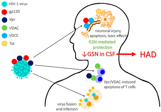 Significant data also suggest a protective role of gelsolin against HIV-1 infections due to (i) weakening HIV-1 Env-gp120-mediated F-actin reorganization and viral receptor capping required for virus fusion and infection and (ii) inhibition of T-cell apoptosis induced by HIV-Viral protein R (Vpr) via blocking the interaction between Vpr and voltage-dependent anion channel (VDAC) [118,119]. Liu et al. reported a neuroprotective role of pGSN as an agent suppressing gp120-induced neuronal injury by preventing the modification of voltage-gated K+ channel Kv2.1 expression [120]. Simultaneously, several reports of alterations in gelsolin concentrations in HIV-infected patients have been presented. Proteomic studies of CSF of patients diagnosed with HIV-1 associated dementia (HAD), a cognitive disturbance resulting from a metabolic encephalopathy caused by secretory products released from immune-competent and virus-infected brain mononuclear phagocytes, have revealed decreased pGSN levels in HIV-infected individuals [59], in agreement with reports of a protective role for pGSN in neuronal cell apoptosis (Figure 3) [120]. New research investigating pGSN expression in the cortex of the brains of rhesus monkeys infected with SIV (simian immunodeficiency virus) presented interesting conclusions: (1) neurons of virus-infected subjects do not secrete high amounts of pGSN; (2) pGSN protects neurons from toxic effects of the HIV protein Tat, which is in part mediated by blocking Tat–integrin interactions; and (3) pGSN accumulates in macrophage nodules formed in response to SIV infection of monkey brains creating locally high levels of this protein in the brain. Despite the accumulation of pGSN in macrophage nodules formed in response to SIV infection of monkey brains, this effect did not reflect the overall decreased level in the CSF compartment [14]. The other important observation from the same cohort of HAD patients was increased expression of gelsolin in HAD sera, which was undetected previously using a different analytical method and upregulated gelsolin levels in HIV-1-infected and HIV-/HCV-coinfected patients, induced likely by increased viral infection, which highlights the importance of the analytical method in evaluation of potential biomarkers [60,121].