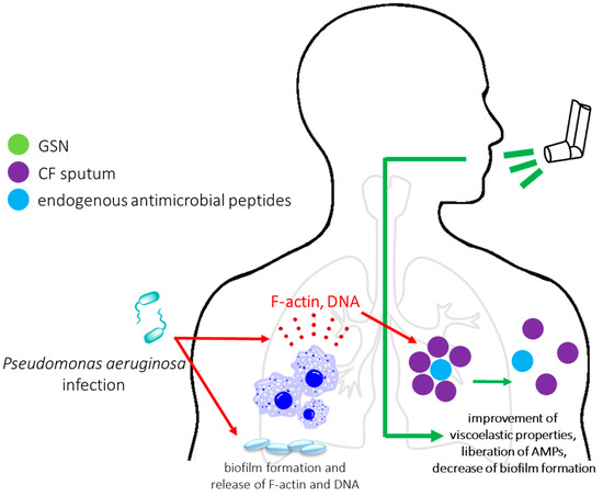 Despite the promising results showing the significant prognostic and therapeutic potential of gelsolin, the most advanced clinical research has focused on the application of plasma gelsolin as a mucolytic agent aimed to decrease the abnormal viscoelasticity of cystic fibrosis (CF) sputum. A change in the viscoelasticity of sputum in CF is caused by accumulation of neutrophil-released DNA and F-actin, and is associated with dysfunction of ciliary transport, resulting in bronchial obstruction and chronic bacterial infections (mainly Pseudomonas aeruginosa) [122,123]. Endogenous antimicrobial agents (including human cathelicidin LL-37, beta-defensins, and lysozymes) are trapped in the CF sputum network, considerably limiting their antibacterial properties [124]. Therefore, it was proposed that disassembly of DNA/F-actin bundles with depolymerizing and actin severing agents, including pGSN, could fluidize CF sputum, improve its viscoelastic properties, increase lung clearance, and liberate antimicrobial peptides, leading to restoration of innate antimicrobial defense [124,125]. These observations justified the introduction of aerosolized gelsolin in phase II clinical trials, which demonstrated good tolerance in humans. Due to no significant improvement of lung expiratory functions (the only measured parameter), further clinical trials were suspended. Despite this, other valuable gelsolin-mediated features, including binding of bacterial endotoxins, prevention of inactivation of antimicrobial peptides [108], and reversal of the stimulatory effect of actin on P. aeruginosa biofilm production in CF lungs [126], indicate that further clinical studies on use of exogenous gelsolin in the treatment of chronic infections that occur in cystic fibrosis airways, alone or in combination with other depolymerizing agents (e.g., Pulmozyme; inhaled recombinant human deoxyribonuclease 1), are justified (Figure 4) [125].