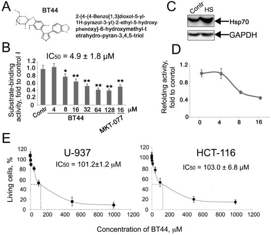 BT44 reduces chaperonic power of Hsp70 and penetrates tumor cells. (A) Chemical structure of [4-(4-Benzo[1,3]dioxol-5-yl-1H-pyrazol-3-yl)-2-ethyl-5-hydroxy-phenoxy]-6-hydroxymethyl-tetrahydro-pyran-3,4,5-triol, BT44; (B) BT44 inhibits substrate-binding activity of Hsp70. Carboxymethylated lactalbumin immobilized on wells of EIA plate was allowed to interact with pure recombinant Hsp70 in a presence of BT44 or MKT-077 and the amount of Hsp70 bound was measured with the use of a specific antibody. The representative data of four independent experiments is presented; (C) Western blot of HeLa cells, control and after heat shock (43 °C, 30 min) and recovered for 6 h. The lysates of HeLa cells, control or heated at 43 °C, 30 min, were subjected to gel electrophoresis and immunoblotting and the membrane was stained with anti-Hsp70 antibody. Data of three experiments is shown; (D) BT44 inhibits the refolding activity of Hsp70 chaperone and penetrates HeLa cells. HeLa cells were transiently transfected with a pcDNA3 plasmid-contained luciferase gene and were then heat shocked (43 °C, 30 min) to denature the enzyme in the presence of BT44 in the concentrations indicated; luciferase activity was measured in cell lysates. The representative data of three independent experiments is presented; (E) Effect of compound BT44 on viability of human cancer cell. U-937 and HCT-116 cells were incubated with BT44 in concentrations of 1, 5, 10, 50, 100, 500, and 1000 µM for 24 h; cell death was measured using trypan blue staining for U-937 and MTT assay for HCT-116 cells. The representative data of three independent experiments is shown.