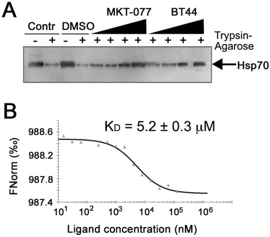 Two assays were used to confirm the direct interaction of BT44 with Hsp70, the DARTS assay and MST (Figure 2). Data from the DARTS assay showed that the proteolytic cleavage of Hsp70 was inhibited by BT44, as the chaperone exhibited increased thermodynamic stability and resistance to cleavage following treatment with Trypsin-agarose []. This effect was observed when the concentration of BT44 was in the micromolar range, in line with the effects of the canonical Hsp70-binder, MKT-077 (Figure 2A) []. This data was confirmed with the aid of MST that allowed us to estimate the KD to be 5.2 ± 0.3 μM (Figure 2B).