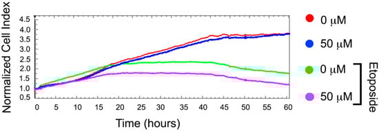 The xCELLigence system (ACEA Biosciences, San Diego, CA, USA) provides noninvasive and label-free monitoring of cell viability and growth in real-time, based on the measurement of the electrical impedance of cells adhered to an electrode on the bottom of the well. Increased impedance indicates an increased number of cells adhered to the bottom at a particular time []. Cultured HCT-116 cells were placed into 16-well E-plates (ACEA Biosciences) at a concentration of 80,000 cells/mL. After 18 h, the cells were treated with BT44 at a concentration of 50 µM for 2 h, and then 100 µM etoposide was added to the cells. Cell proliferation was monitored for 60 h using the xCELLigence Real Time Cell Analysis (RTCA) System. Data analysis was performed using RTCA Analysis Software.