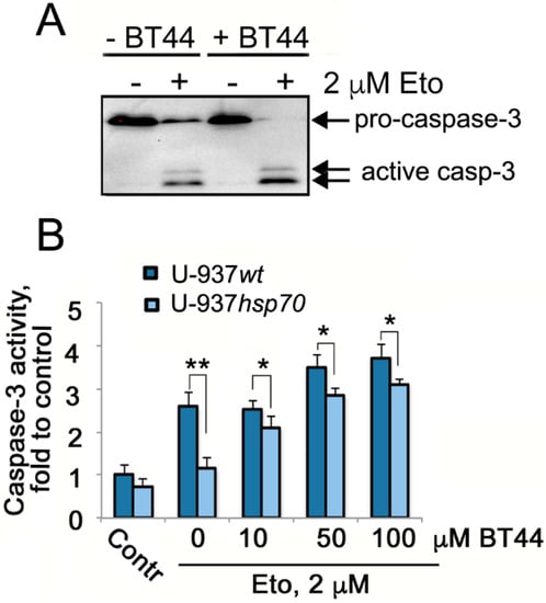 BT44 enhances Caspase-3 cleavage in U-937 cells treated with etoposide. (A) Western blot of U-937wt cells treated with BT44 and etoposide, alone or in combination. The membrane was stained with antibody against Caspase-3; (B) U-937wt and U-937hsp70 were treated with BT44 in concentrations indicated and etoposide (2 μM), alone or in combination, and Caspase-3 cleavage was estimated with the aid of Caspase-3 enzymatic activity assay. A statistical difference was determined by a value of * p < 0.05, ** p < 0.01. The representative data of two experiments is presented.