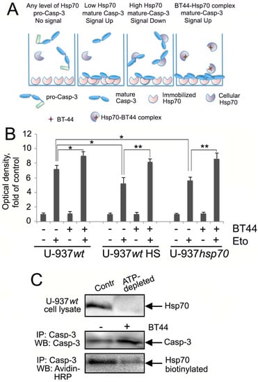 BT44 prevents binding of Hsp70 to Caspase-3 in etoposide-treated, Hsp70 over-expressing U-937 cells. (A) The scheme illustrating protein–protein interaction assay (Figure 6B). In cells with low levels of Hsp70 (U-937wt and U-937scr), the number of chaperone molecules was not sufficient to trap all molecules of activated Caspase-3 which bound to Hsp70 immobilized on the well surface; BT44 induced destabilization of Hsp70 and Caspase-3 complex and made the enzyme molecules to stick to Hsp70 more efficiently, and signal was elevated. When cellular Hsp70 was overexpressed (U-937wt after HS and U-937hsp70), more molecules of activated Caspase-3 were bound to cellular Hsp70, less Caspase-3 was trapped by the immobilized chaperone, and signal decreased. Cellular Hsp70 was inactivated in the presence of BT44 so the number of activated Caspase-3 molecules available for trapping with the immobilized Hsp70 was elevated; (B) Competitive protein–protein interaction assay data. U-937wt, control and after heat shock (43 °C, 30 min, 6 h of recovery), and U-937hsp70, were treated with 50 µM BT44 and 1 µM etoposide, alone or in combination and the cell lysates were used for analysis. The plate was then incubated for 3 h. The data of four independent experiments is shown; A statistical difference was determined by a value of * p < 0.05, ** p < 0.01; (C) U-937wt cells were treated with etoposide and 4 h later Hsp70 was depleted from cell lysate with the aid of ATP-agarose. After immunoprecipitation with anti-Caspase-3 antibody, gel slurry with Protein G-anti-Caspase-3 antibody and Caspase-3 was transferred to tubes containing pure biotinylated Hsp70 pretreated or not with BT44, and the gels with the proteins attached were subjected to electrophoresis and immunoblotting. The blot was stained using antibody to Caspase-3 and Avidin-peroxidase (Avidin-HRP). The data of two independent experiments is shown.