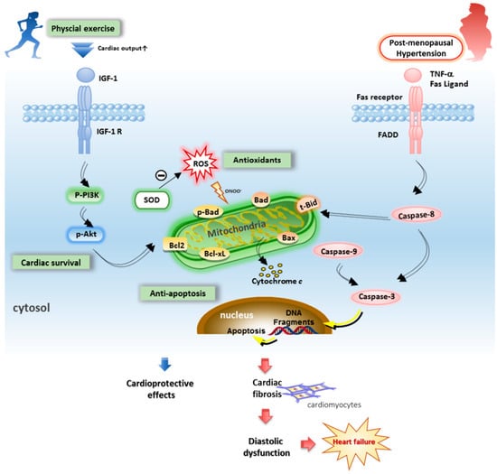 Lifestyle changes and regularly performed physical activity can counteract defects in associated heart failure processes. Aerobic exercise training is a well-known benefit adaptive to the cardiovascular system. A study conducted by Almeida et al. shows that exercise training attenuated interstitial collagen and myocyte hypertrophy, which improved cardiac functioning and attenuation of cardiac remodeling in ovariectomized rats after myocardial infarction [43]. Our previous studies also reported that exercise training can significantly improve cardiac apoptosis in hypertension [44] and ovariectomies [45]. Exercise training prevented hypertension-induced cardiac Fas-dependent and mitochondria-dependent apoptotic pathways via enhanced cardiac insulin-like growth factor 1 receptor (IGFI-R)/phosphoinositide 3-kinase (PI3K)/protein kinase B (Akt) and Bcl-2-family-associated prosurvival pathways in hypertension [44]. Moreover, estrogen deprivation by ovariectomy displays cardiac Fas-dependent and mitochondria-dependent apoptotic pathways which appear to be improved after exercise training [45]. One report suggests that exercise training exerts beneficial effects which in turn diminish adverse cardiac wall remodeling, mainly by reducing interstitial myocardial fibrosis, improving myocardial vascularization, and sustaining the number of cardiomyocytes [16]. These findings revealed that either hypertension or ovariectomy after exercise training provides beneficial effects on cardiac function and cardiac remodeling by the altered regulation of the specific gene and protein expression that regulate myocardial apoptosis and fibrosis. Until now, the influences and molecular mechanisms of resistance training or combined resistance and endurance training in the hypertensive, postmenopausal population remain unclear and need further investigation. After integrating previous findings into hypothesized pathophysiology, we hypothesize that exercise training may suppress cardiac Fas- and mitochondrial-dependent apoptotic pathways in the coexistence of hypertension and ovariectomy. Apoptotic cadiomyocyte and accumulated collagens can also contribute to the development of cardiac fibrosis and heart failure (Figure 2).