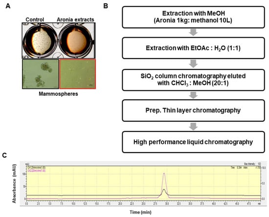Isolation of the cancer stem cell (CSC) inhibitor from aronia and assessment of the aronia extracts via mammosphere formation assay. (A) Assay of mammosphere formation inhibition using aronia extracts. The mammospheres were incubated with aronia extracts or DMSO. MDA-MB-231 cells were treated with aronia extracts or DMSO in CSC culture media for seven days. Images were obtained by microscopy at 10× magnification and were representative mammospheres (scale bar = 100 µm). (B) Isolation procedure of the mammosphere-forming inhibitor. (C) HPLC chromatogram of the inhibitor isolated from the aronia extracts.