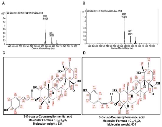 The chemical structures of the compounds isolated were determined by mass spectrometry and NMR measurements. The molecular weight of 3-O-trans-p-coumaroyltormentic acid was established as 634 by ESI mass spectrometry, which showed quasimolecular ion peaks at m/z 635.2 [M + H]+ in positive mode and at m/z 633.2 [M − H]− in negative mode (Figure 2A,B). The 1H NMR spectrum of 3-O-trans-p-coumaroyltormentic acid in CD3OD exhibited signals due to aromatic methine protons at δ 7.45 and 6.38, which are attributable to a 1,4-disubstituted benzene, and two trans-conjugated olefinic protons at δ 7.61 and 6.80 that were identical to signals for trans-p-coumaric acid. Additional signals in the 1H NMR spectrum were typical for a triterpenoid. The 39 carbons in the 13C NMR spectrum were evident, and the chemical shifts of the signals due to the triterpene portion were in agreement with those of tormentic acid, suggesting that the structure of 3-O-trans-p-coumaroyltormentic acid is tormentic acid esterified with coumaric acid. All of the proton-bearing carbons were assigned by the HMQC spectrum, and the 1H-1H COSY spectrum revealed eight partial structures (see Supplementary Materials). Further structural confirmation was performed by assessment of the HMBC spectrum, which showed a long-range correlation from the methine proton at δ 5.01 to the carbonyl carbon of coumaric acid at δ 169.4. Other HMBC correlations were well-matched to coumaroyltormentic acid (Figures S4–S13). Therefore, the structure of the compound was identified as 3-O-trans-p-coumaroyltormentic acid (Figure 2C).
