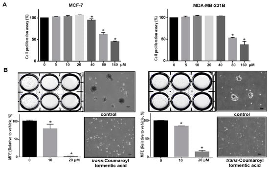 We first examined the antiproliferative effect of 3-O-trans-p-coumaroyltormentic acid in the human breast cancer cell lines MCF-7 and MDA-MB-231 by MTS (3-(4,5-dimethylthiazol-2-yl)-5-(3-carboxymethoxyphenyl)-2-(4-sulfophenyl)-2H-tetrazolium) assay. There was a concentration-dependent inhibition of cell proliferation at ≥40 μM (MCF-7) and ≥80 μM (MDA-MB-231) 3-O-trans-p-coumaroyltormentic acid after 48 h of stimulation (Figure 3A). These results showed that 3-O-trans-p-coumaroyltormentic acid effectively inhibits the proliferation of these breast cancer cell lines. To evaluate whether this compound can suppress the formation of tumorspheres or mammospheres, we treated 3-O-trans-p-coumaroyltormentic acid to primary mammospheres derived from MCF-7 and MDA-MB-231 cells. As shown in Figure 3B, 3-O-trans-p-coumaroyltormentic acid effectively inhibited the formation of primary mammospheres derived from breast cancer cell lines. Not only did the numbers of mammospheres decline by 90%, the size of mammospheres was also reduced (Figure 3B). In addition, 3-O-cis-p-coumaroyltormentic acid inhibits cell proliferation at concentrations ≥80 μM (MCF-7 and MDA-MB-231 cells) after 48 h of stimulation (Figure 3C) and the formation of primary mammospheres derived from breast cancer cell lines at 40 μM (Figure 3D). The treatment with 3-O-trans-p-coumaroyltormentic acid inhibited the migration and colony formation of MDA-MB-231 cells (Figure 3E,F). These results showed that 3-O-trans-p-coumaroyltormentic acid effectively inhibits mammosphere formation and the various cancer hallmarks (proliferation, migration, and colony formation).