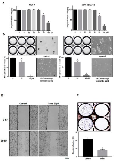 The effect of 3-O-p-coumaroyltormentic acid on the viability and mammosphere-forming ability of MCF-7 and MDA-MB-231 cells. (A) MCF-7 and MDA-MB-231 cells were treated with increasing concentrations of 3-O-trans-p-coumaroyltormentic acid for 48 h. The antiproliferative effect of 3-O-trans-p-coumaroyltormentic acid was measured by the MTS (3-(4,5-dimethylthiazol-2-yl)-5-(3-carboxymethoxyphenyl)-2-(4-sulfophenyl)-2H-tetrazolium) assay. (B) Effect of 3-O-trans-p-coumaroyltormentic acid on the formation of mammospheres derived from MCF-7 and MDA-MB-231 cells. The mammospheres were incubated with either 3-O-trans-p-coumaroyltormentic acid (10 and 20 μM) or DMSO for seven days (scale bar = 100 μm). (C) MCF-7 and MDA-MB-231 cells were treated with increasing concentrations of 3-O-cis-p-coumaroyltormentic acid for 48 h. The antiproliferative effect of 3-O-cis-p-coumaroyltormentic acid was measured by the MTS assay. (D) Effect of 3-O-cis-p-coumaroyltormentic acid on the formation of mammospheres derived from MCF-7 and MDA-MB-231 cells. The mammospheres were incubated with either 3-O-cis-p-coumaroyltormentic acid (20 and 40 μM) or DMSO. MCF-7 and MDA-MB-231 cells were treated with 3-O-cis-p-coumaroyltormentic acid or DMSO in CSC culture media for seven days. Images were obtained by microscopy at 10× magnification and were representative mammospheres (scale bar = 100 μm). (E) Effect of 3-O-trans-p-coumaroyltormentic acid on migratory potential of human breast cancer cells. The wound healing of MDA-MB-231 cells with or without 3-O-trans-p-coumaroyltormentic acid photographed at 0 and 18 h (scale bar = 100 μm). (F) Effect of 3-O-trans-p-coumaroyltormentic acid on colony formation on human breast cancer cells. The dissociated 1000 MDA-231-MB cells were seeded in six-well plates and treated with an indicated concentration of 3-O-trans-p-coumaroyltormentic acid and DMSO for seven days. Representative images of colonies were recorded. The data shown represent the mean ± SD of three independent experiments. * p < 0.05 vs. DMSO-treated control.