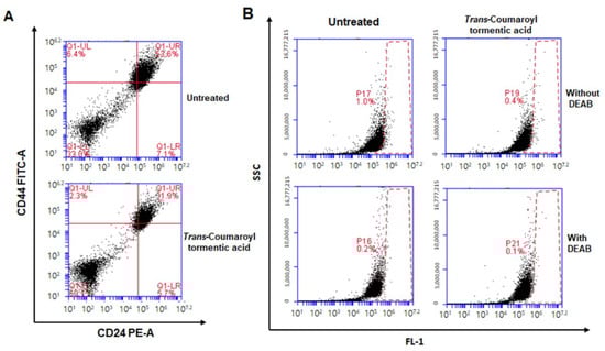 2.4. Treatment with 3-O-trans-p-Coumaroyltormentic Acid Decreased the CD44high/CD24low-Expressing Subpopulation and the Proportion of ALDH-Positive Breast Cancer Cells