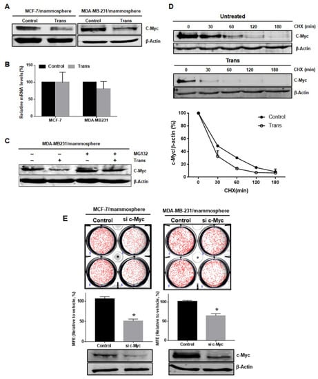 The trans-coumaroyltormentic acid (Trans) promotes the proteasome-mediated degradation of c-Myc in breast CSCs. (A) Trans reduced the protein level of c-Myc. Cells were treated with Trans (20 μM) for 24 h. Total cell lysates were subjected to Western blot analysis with specific antibodies. β-Actin was used as an internal control. (B) Transcriptional expression of c-Myc genes of CSCs was determined in Trans- and DMSO-treated mammospheres using c-Myc-specific primers and real-time PCR. β-Actin served as an internal control. (C) Mammospheres were incubated with MG-132 and Trans (20 μM) for 24 h and lysed for Western blot analysis. (D) The cycloheximide (CHX) chase assays showing the half-life of c-Myc protein. The mammospheres were treated with CHX at 100 µg/mL for the indicated times. The half-life of endogenous c-Myc protein was measured by Western blot and analyzed. Each point represents the mean ± SD of triplicate experiments. (E) Effect of c-Myc protein on mammosphere formation using siRNA knockdown of c-Myc. The mammospheres derived from siRNA-treated cells were cultured for seven days. Images were obtained by microscopy at 10× magnification and are representative mammospheres (scale bar = 100 μm). The data shown represent the mean ± SD of three independent experiments. * p < 0.05 vs. DMSO-treated control. All of the immunoblots are representative of more than three independent experiments.