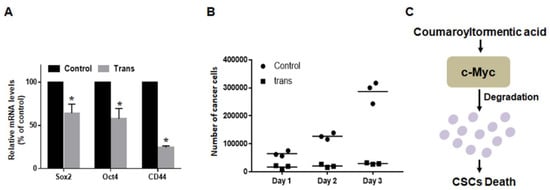 To determine whether 3-O-trans-p-coumaroyltormentic acid inhibits the expression of self-renewal genes, we examined the expression levels of some self-renewal genes by real-time RT-PCR. Treatment with 3-O-trans-p-coumaroyltormentic acid decreased the expression of Sox2, CD44, and Oct4 in breast CSCs (Figure 6A). To confirm that 3-O-trans-p-coumaroyltormentic acid inhibits mammosphere proliferation, mammospheres were treated with 3-O-trans-p-coumaroyltormentic acid, and cell numbers within the mammospheres were counted. 3-O-trans-p-Coumaroyltormentic acid induced the cell death of mammospheres, and a lower cell number was observed in 3-O-trans-p-coumaroyltormentic acid-treated mammospheres. This result indicated that 3-O-trans-p-coumaroyltormentic acid led to a dramatic decrease in mammosphere proliferation (Figure 6B). Taken together, these results suggest that 3-O-trans-p-coumaroyltormentic acid inhibits the self-renewal and proliferation of CSCs.