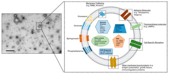 Mesenchymal stem/stromal cell-exosomes (MEx). (Left panel) Transmission electron microscopy (TEM) image of human umbilical Wharton’s jelly-derived MEx. Scale bar = 500 nm. (Right panel) Schematic representation of MEx composition. MEx contain molecules associated with the pathways of their biogenesis, such as small G-proteins RABs, tumor susceptibility gene 101 (TGS101), programmed cell death 6 interacting protein (Alix), Syntenin, Annexins, and Flotillin 1 (FLOT1). MEx’s cargo includes small non-coding RNAs, but also macromolecular modules, growth factors, and metabolic enzymes. Although heterogenous by nature, typically, exosomes have a diameter of 35–150 nm. Adapted from Willis et al. [96] and Willis et al. [28]. Multivesicular bodies (MVB); endosomal sorting complexes required for transport (ESCRT); glyceraldehyde 3-phosphate dehydrogenase (GAPDH); lysosome-associated membrane glycoprotein (LAMPs).