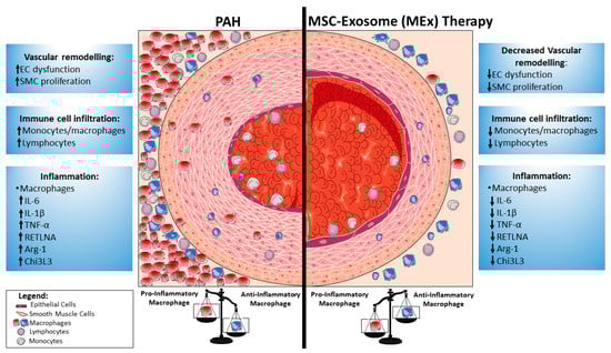 An improved molecular understanding of the role macrophages play in immune responses relevant to PAH pathophysiology may pave the way for new therapeutic tools to effectively treat and reduce the risk of further complications. Here, we speculate that manipulation of lung macrophage function represents an attractive target for emerging therapeutic approaches. Exhibiting potent immunomodulatory capabilities, MSC-based approaches have been shown to be effective in ameliorating injury and/or reestablishing homeostasis in several preclinical models of lung disease relevant to PAH. Several studies have shown that the therapeutic capacity of MSCs is harnessed in their secretome, and more recent studies have demonstrated that the ‘major’ therapeutic vector therein is represented by the exosomes. In turn, exosome-based therapeutics represent a most promising next generation approach for treating a diverse number of diseases, particularly diseases the pathogenesis of which involve a primary (or major) inflammatory component. Although more studies are needed to address this issue, in this review, we postulate that MEx modulate macrophage function, which in turn, is responsible, at least in part, for the beneficial effects of MEx treatment in experimental models relevant to PAH.