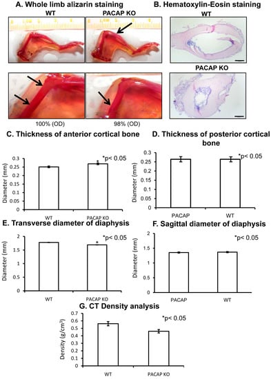 Morphological analysis of hind limbs of wild type (WT) and pituitary adenylate cyclase activating polypeptide (PACAP) knockout (KO) mice. Whole limb alizarin red staining (A), optical density (OD) was determined in 1 cm distal part of the femur. Hematoxilin-eosin (HE) staining (B) to visualize the histological differences. Original magnification was 4×. Scale bar, 500 µm. CT analysis (C–G) of mouse femurs. Representative data of 5 independent experiments. Asterisks indicate significant (* p < 0.05) difference in thickness of cortical bone or in the diameter of diaphysis compared to the respective control.