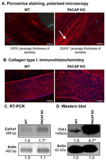 Morphology of the femur was not altered in spite of the elevated inorganic bone matrix production, therefore, further analysis of organic matrix production was performed. Orientation of collagen type I-made fibers in a cortical lamella is a crucial factor in determining the microscopical structure and macroscopic morphology of compact bone. Therefore, this organic component of compact bone was further investigated. Concentric lamellae of compact bone were found thicker in PACAP gene deficient mice shown with picrosirius red staining in polarization microscope (Figure 3A). Collagen fibers in WT animals were present, although they seemed to be thinner (Figure 3A and Figure S5A). Furthermore, the immunohistochemical analysis verified the previous results (Figure 3B and Figure S5B): concentric collagen lamellas were visualised in both experimental groups with stronger signals of PACAP KO mice (Figure 3B). Immunopositivity around the osteocytes had no significant differences between WT and KO mice (Figure 3B and Figure S5B). To detect the total expression of collagen type I, reverse transcription followed by polymerase chain reaction (RT-PCR) and Western blot were performed. mRNA expression of the major organic extracellular matrix component was elevated in PACAP gene deficient animals (Figure 3C and Figure S5C), and a dramatically increased protein expression was also observed (Figure 3D and Figure S5D).