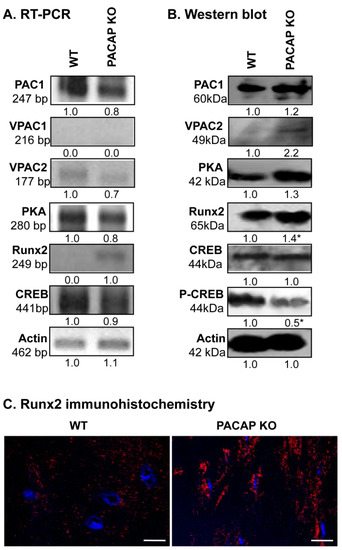 PACAP signalisation in bones. (A) mRNA and (B) protein expression of pituitary adenylate cyclase-activating polypeptide type I receptor (PAC1), vasoactive intestinal polypeptide receptor (VPAC)1, VPAC2,protein kinase A (PKA), cyclic adenosine monophosphate (cAMP) response element-binding protein (CREB), Runx2 in cortical bone. Actin was used as a control. Numbers below signals represent integrated signal densities determined by ImageJ software. Asterisks indicate significant (* p < 0.05) alteration of expression compared to the respective controls. Representative data of 3 independent experiments. (C) Immunohistochemistry of Runx2 in cortical bones. Original magnification was 60×. Scale bar: 5 µm. Representative data of 3 independent experiments.