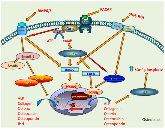 Schematic drawing of the possible signalling pathways regulated by PACAP in bone formation. PAC1 receptor activation leads to the increase of intracellular cAMP, which activates PKA. Downstream targets of PKA can be CREB or Runx2 transcription factors which activations induce the expression of collagen type I, osterix, osteocalcin, ostepontin and ALP. BMP6 and BMP7 binding to BMPR1 triggers the activation of Smad cascade which can induce the expression of collagen type I, osterix, osteocalcin, ostepontin, ALP and IHH. The activation of BMP signalling is fine-tuned by the activation of PACAP signalling. Runx2 phosphorylation can occur via BMPR1 activation, showing a PACAP independent mechanism. IHH and SHH activate Gli1 transcription factor which is inhibited by PACAP signalling. This signalling pathway is also responsible for the activation of collagen type I and ALP expression. Increased ALP expression and activation elevates the Ca2+ phosphate production. PACAP signalling keeps a balance between BMP and hedgehog signalling activation via this regulates proper bone formation.