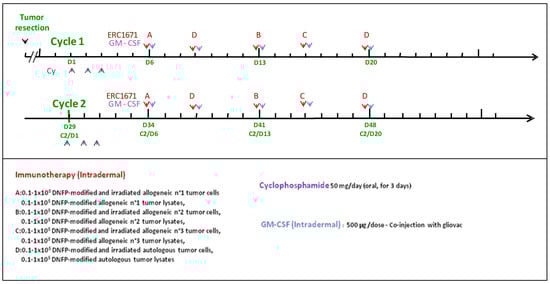 Figure 1). Each immunization is given together with GM-CSF (granulocyte-macrophage colony-stimulating factor) to support local immune system priming. In addition, a low dose of cyclophosphamide (Cy) is given a few days before each immunization cycle to deplete immune inhibitory cells in the patient (please see below the treatment details). By using this injection schedule, GLIOVAC/ERC1671 evokes an oligoclonal and partly allo-specific immune induction, based on the application of a broad set of tumor antigens derived from freshly resected glioma tumor tissues from the patient and three unrelated tumor tissue donors.
