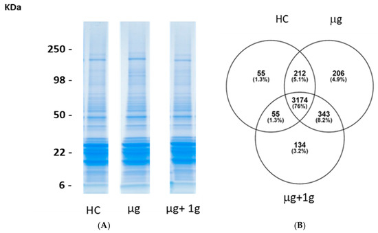 Proteins identified from µg, μg + 1 g, and habitat controls (HC) by high-resolution mass spectrometry. (A) Five micrograms of protein was resolved by one-dimensional sodium dodecyl sulfate–polyacrylamide gel electrophoresis (SDS-PAGE) and visualized by Coomassie-staining. Eyecups contain retinal layers were used for proteomic analysis. Samples were analyzed with six biological replicates. Each gel lane was sliced into 24 equivalent sections. Protein in each gel slice was digested in-gel with trypsin and identified by high-resolution mass spectrometry; (B) a Venn diagram represents the number of total proteins identified from each group. Seventy-six percent of the proteins were identified in all three groups.