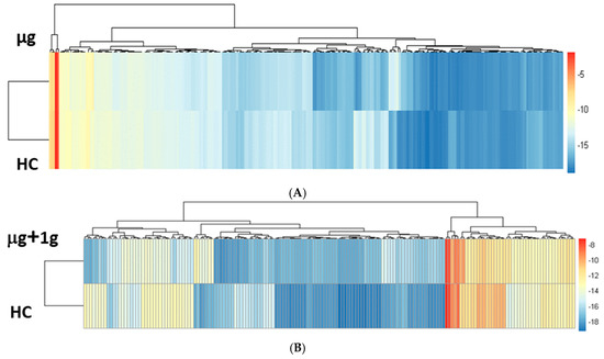 Unsupervised hierarchical clustering of significantly differentiating proteins. (A) Significant proteins between the µg versus habitat controls (HC). 250 Significant proteins based on false discovery rate (FDR) adjusted (p < 0.05); (B) significant proteins between µg + 1 g versus HC. 171 Significant proteins based on FDR adjusted (p < 0.05). Unsupervised hierarchical clustering of the log2 normalized iBAQ intensities for significantly differentiating proteins was performed using the Euclidean distance metric with oheatmap R package. The hierarchical cluster was generated for comparison and visually represents the significant protein intensities for each sample group. The intensities were standardized by the mean and standard deviation before clustering. Proteins were considered significant based on Mann–Whitney U FDR corrected p-value < 0.05.
