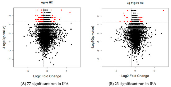 Volcano plots show differentially expressed proteins (FDR adjusted p < 0.05 and fold change >2). (A) µg versus HC: 77 significant run in Ingenuity Pathway Analysis (IPA); (B) µg + 1 g versus HC: 23 significant run in IPA. Volcano plots were generated based on fold-change of protein levels using the log2 normalized iBAQ intensities from six biological replicates. The x-axis indicates a log2 fold-change and the y-axis indicates −log10 p-value based on a Mann–Whitney U test with a FDR adjusted p-value. The horizontal line indicates a p-value < 0.05 and the vertical lines represent a fold-change >2.