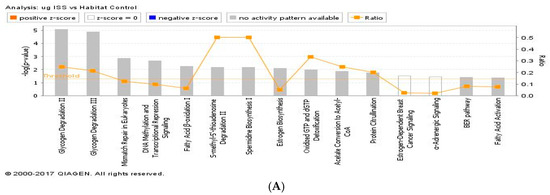 These differentially expressed proteins were then analyzed using Ingenuity Pathway Analysis (IPA, QIAGEN Redwood City, www.qiagen.com/ingenuity) [14]. There were significant changes in canonical pathways and upstream regulators in the pathway analysis for flight groups compared to the HC controls. Our proteomic analysis identified only 33 upstream regulator proteins based on the Z-scores used to predict either activation (Z-score > 0) or inhibition (Z-score < 0) in the µg + 1 g animals compared to HC mice that involves disease development, molecular/cellular function and cell signaling, while 60 regulators were identified in the µg group compared to HC mice. IPA analysis revealed many key pathways are affected that are responsible for cell death, cell repair, inflammation, carbohydrate metabolism, mitochondrial function, fatty acid metabolism, and oxidative phosphorylation when comparing the µg group with HC group. Pathways were considered significant based on the Fisher exact test with a −log10 p-value > 1.3 (corresponds to a p-value < 0.05). Significantly affected canonical pathways between µg + 1 g vs. HC or µg group vs HC or are shown in Figure 5A,B, respectively. There were also significant changes in regulated protein expression in the pathway analysis for µg or µg + 1 g groups compared to HC group or µg group vs. µg + 1 g group. There was very little overlap of significantly regulated protein between µg vs. HC and µg + 1 g vs. HC. In the µg group, there was significant alteration in functions related to overall organismal survival, cellular assembly and metabolism. Significant increased or decreased protein expression levels are summarized and listed in Table 1, Table 2 and Table 3.