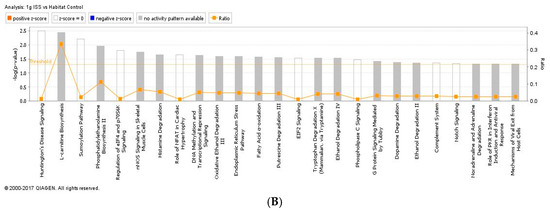 (A) IPA of top canonical pathways altered between µg and habitat control (HC) ocular tissue; (B) IPA of top canonical pathways altered between µg + 1 g and HC ocular tissue. −log10 (p-value) ≥ 1.3 = significant at p ≤ 0.05. The differentially expressed proteins were analyzed by IPA.