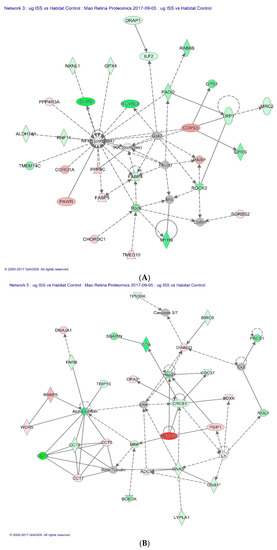 (A) Impact of spaceflight condition (µg group) on CLIP2 expression in the network of proteins responsible for cellular assembly and organization, cell signaling and interaction. Red = up-regulated (p < 0.05). Grey = un-changed. Green = down-regulated (p < 0.05); (B) Impact of spaceflight condition (µg group) on MECP2 protein expression in the network of proteins involving in cell death and survival response. Red = up-regulated (p < 0.05). Grey = un-changed. Green = down-regulated. (A,B) are generated with IPA software. More detailed description of the legends (squares, circles, etc.) can be found at the Ingenuity Systems website.