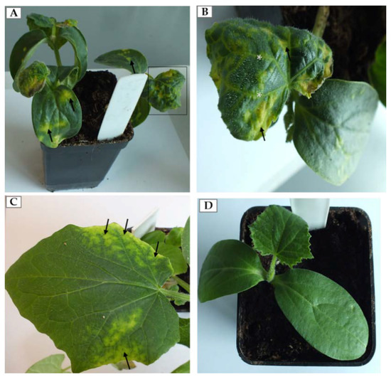 Morphological alternations of infection caused by Prune dwarf virus (PDV) on cucumber. (A) Chlorotic spots (arrow) on the cotyledons and leaves of cucumber infected by PDV (14 dpi). The black frame area is enlarged in (B); (B) Enlarged deformed leaf with chlorotic spots (arrow) and yellowing veins (*); (C) Yellowing of leaf blades along the edges (arrow) at 14 dpi; (D) Mock-inoculated cucumber plants without symptoms (14 dpi).