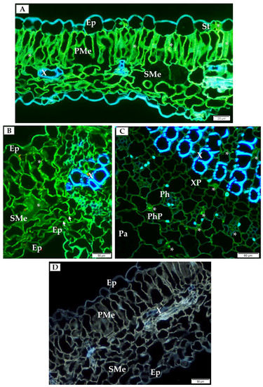 Immunofluorescence localization of PDV-coat protein (PDV-CP) epitopes in the infected cucumber leaf tissue of Polan variety (14 dpi). (A) Localization of the epitopes of PDV-CP (green fluorescence, marked with *) in stomata and palisade mesophyll cells (14 dpi), Bar 20 µm; (B) PDV-CP epitope (*) inside spongy mesophyll (14 dpi). Deformations of cell wall in spongy mesophyll cell are marked with white arrows, Bar 50 µm; (C) Cross section of cucumber leaf through main vein with presence of CP (*) in xylem and phloem parenchyma (14 dpi), Bar 50 µm; (D) Section of mock-inoculated leaf without PDV-CP, Bar 50 µm. Abbreviations: Ep—epidermis, St—stomata, PMe—palisade mesophyll, SMe—spongy mesophyll, Pa—parenchyma, X—tracheal element, XP—xylem parenchyma, Ph—phloem, PhP—phloem parenchyma.