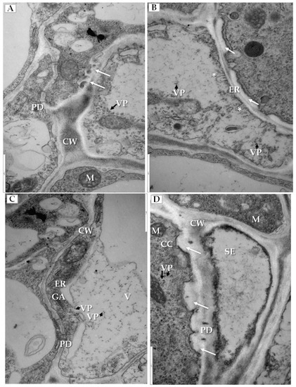 Changes in cell wall structure and plasmolemma in phloem cells of PDV infected cucumber leaves. (A) Fragment of phloem parenchyma with cell-wall invaginations (white arrow). Viral particles (VP, black arrow) in phloem parenchyma cell, Bar 1 µm; (B) Fragments of phloem parenchyma cells with irregular cell wall (white arrow) and plasmalemma invaginations (*) and with viral particles (VP, black arrow), Bar 1 µm; (C) Presence of viral particles (VP, black arrow) inside the vacuole with the vacuolar lumen having connections to the cytoplasm of parenchyma cell, Bar 1 µm; (D) An irregular and thicker cell wall (white arrow) between companion cell with viral particles (VP, black arrow) and sieve tube, Bar 1 µm. Abbreviations: CW—cell wall, PD—plasmodesmata, ER—endoplasmic reticulum, GA—Golgi apparatus, MT—movement protein induced tubular structures, VP, black arrow—viral particles, SE—sieve tube, CC—companion cell, M—mitochondrion, V—vacuole.