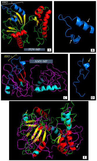 Three-dimensional (3D) model structures of the PDV movement protein (PDV-MP) and AMV movement protein (AMV-MP). (A) 3D model of PDV-MP structure. The colors show the particular elements of the secondary structure, as follows. Green indicates the fragments of straight polypeptide chain, red—α-helical fragments, yellow—β-card fragments, blue-RNA binding domain (RBD); (B) The blue color represents the RBD structure of PDV-MP, enlarged from (A). White arrows indicate two α-helical fragments of this domain; (C) 3D model of AMV-MP structure. The colors show the particular elements of the secondary structure as follows. Purple indicates the fragments of straight polypeptide chain, green—α-helical fragments, red—β-card fragments, blue—RNA binding domain (RBD); (D) The blue color show RBD structure of AMV-MP enlarged from (C). Yellow arrow specifies the α-helical fragment of this domain; (E) Overlaid of 3D models of PDV-MP and AMV-MP. Yellow and white arrows show AMV-MP and PDV-MP, respectively. The colors represent the particular elements as shown in (A,C) for PDV-MP and AMV-MP, respectively.
