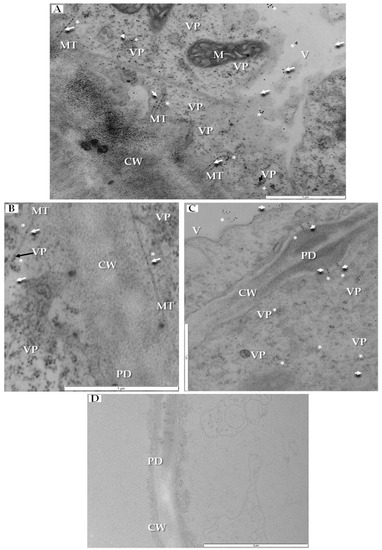 Double-immunogold localization of PDV movement protein (MP) and coat protein (CP) in infected cucumber leaf tissues (14 dpi). (A) MP epitopes (white arrow) and CP epitopes (*) colocalized in tubular structures in plasmodesmata, cytoplasm and vacuole. CP epitopes (*) on the surface of viral particles. Labeled viral particles in cytoplasm (VP, black arrow), Bar 1 µm; (B) Viral particles (VP, black arrow) in tubular structure. Co-localization of MP epitopes (white arrow) and CP epitopes (*) are visible, Bar 1 µm; (C) Two types of gold particles (* and white arrow) from CP and MP co-localized in cytoplasm and in plasmodesma, Bar 1 µm; (D) Fragment of parenchyma cell from mock-inoculated cucumber without MP and CP epitopes, Bar 1 µm. Abbreviations: CW—cell wall, PD—plasmodesmata, M—mitochondrion, V—vacuole, MT—movement protein induced tubular structures, VP—viral particles.