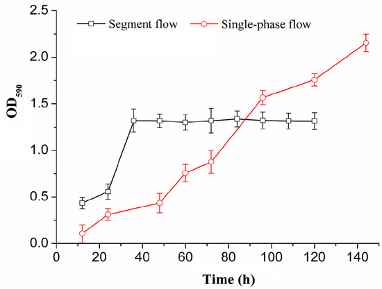 The results indicated that a large number of strains adhered on the surface of the modified microchannel were more stable in the initial stage of biofilm growth. This stability resulted from the stronger resistance to fluid shear force caused by the increase of adhesion strength, thereby, accelerating the growth rate of the biofilms [27]. However, the growth of the biofilms was limited by factors such as flow rate, oxygen content, and nutritional status; the total amount of the biofilms eventually reached a steady value with a tendency to balance [28]. There was no significant difference in the total biomass of biofilms in modified and unmodified microchannels after equilibrium was reached. That might be due to the fact that the growth of the biofilms in the segmented flow microchannel was only related to the fluid flow in the channel and oxygen consumption. It had nothing to do with the amount of strain initially adsorbed, but the initial amount of bacteria affected the rate of growth of the biofilms. Therefore, the surface modification of channels was used to adsorb the recombinant strains which then had a positive effect on shortening the culture time of the biofilms.
