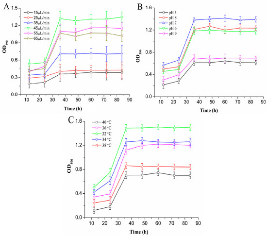 Effects of different flow rates (A), pH (B), and temperature (C) on the formation of recombinant E. coli BL21-pET28a-egfp biofilms.