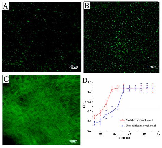 The photos of recombinant E. coli BL21-pET28a-egfp on unmodified (A) and modified (B) microchannel surfaces under inverted fluorescence microscope. The photo of recombinant E. coli biofilms on the modified microchannel surfaces under inverted fluorescence microscope after 30 h (C). The total biomass of recombinant E. coli biofilms were compared in unmodified and modified microchannels (D).