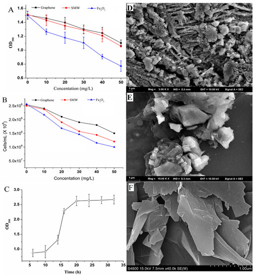 Effects of different nanomaterials and concentrations on growth of biofilms (A) and recombinant E. coli BL21-pET28a-egfp (B). The growth of recombinant E. coli biofilms with graphene nanomaterial was measured under segment flow mode (C). The SEM patterns of biofilms formed in microchannels with LB medium (D), LB medium containing graphene sheets (10 mg/L) (E), and graphene sheets (F).