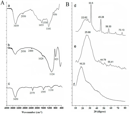 The FT-IR spectra (A) and X-ray diffraction patterns (B) of biofilms formed with LB medium and LB medium containing graphene nanomaterials (10 mg/L) in a microreactor by segment flow. Biofilm formed with LB medium (a,d); biofilm formed with LB medium containing graphene nanomaterials (10 mg/L) (b,e); graphene nanomaterials (c,f).