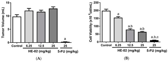 Effect of HE-02 (6.25, 12.5 or 50 mg/kg) on (A) Tumoral volume and (B) Cell viability. Data presented as mean ± standard error of mean (SEM) of six animals analyzed by analysis of variance (ANOVA) followed by Tukey test. a p < 0.05 compared to tumor control group, b p < 0.05 compared to 6.25 mg/kg dose. c p < 0.05 compared to all HE-02 doses.